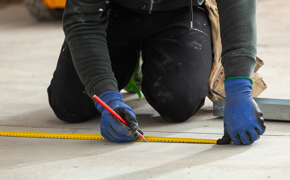 Dicht eerst gaten en kieren in de vloer met siliconenkit en laat die uitharden. Bereken dan hoeveel mortel je nodig hebt op basis van de oppervlakte en de gewenste laagdikte.